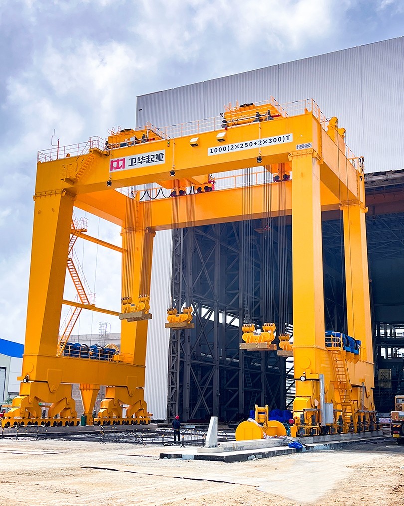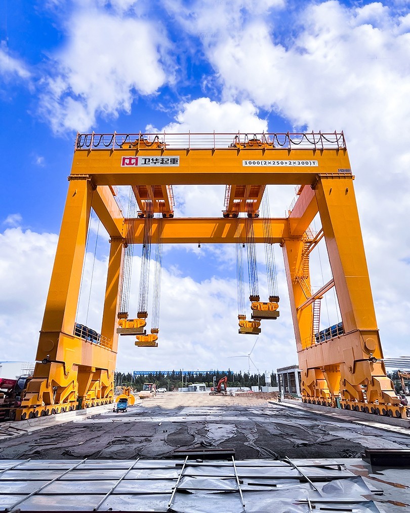 根据项目起吊重量大、工况复杂、控制精度高等特点,世界杯下单平台网站官网起重机采用U型门架结构,双龙门四点吊装,最大起吊重量1000t,最大吊点高度大于18m,采用变频+PLC控制,可实现横向、纵向距离可调,及吊梁自由旋转,控制精度达±1mm。