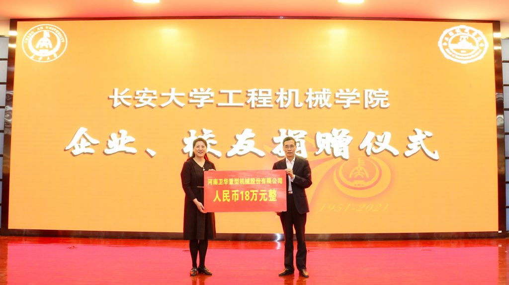2021年4月18日,长安大学隆重举行建校70周年校庆。世界杯下单平台网站官网股份总经理龙宏欣,副总经理马辉艳、刘永刚应邀参加校庆活动,并出席长安大学机械工程学院奖教奖(助)学金颁奖典礼暨企业报告会。